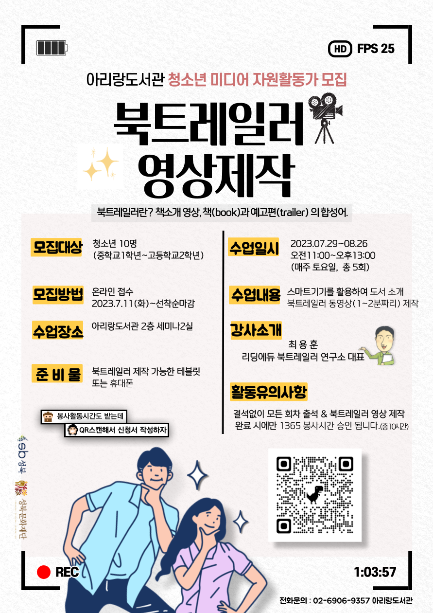 [모집] 아리랑도서관 청소년 미디어 자원활동가 북트레일러 접수 안내(7/11~선착순)