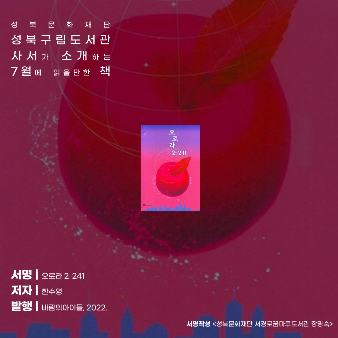 인류의 역사를 바꾼 이브, 파리스, 빌헬름 텔, 뉴턴, 스티브 잡스, 세잔의 사과가 있었다. 그리고 여기 지구 최후의 사과 품종, 오로라 2-241. 마치 한 편의 SF영화를 보는 듯 쉽게 읽히지만 소설이 주는 메시지는 직접적이고 울림이 크다. 요즘의 잦은 기상이변, 기후위기는 더 이상 먼 미래의 이야기가 아니다. 기후 위기라는 문제를 풀기 위해 지금의 우리가 무엇을 해야 할지, 깊이 생각하게 만드는 책이다. 2023 성북구 한 책 최종후보도서 4권에 선정되어 성북구립도서관에서 다채로운 행사로 함께 즐길 수 있다.