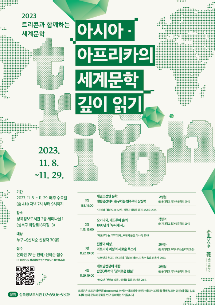 이번 강의에서는 트리콘과 함께 조금은 낯선 아시아·아프리카 문학과 문화를 통해 새로운 세상을 바라보며 문제의식과 가능성을 이해하고, 세계문학의 영역을 넘어 인식의 지평을 넓히는 자리가 될 것입니다.