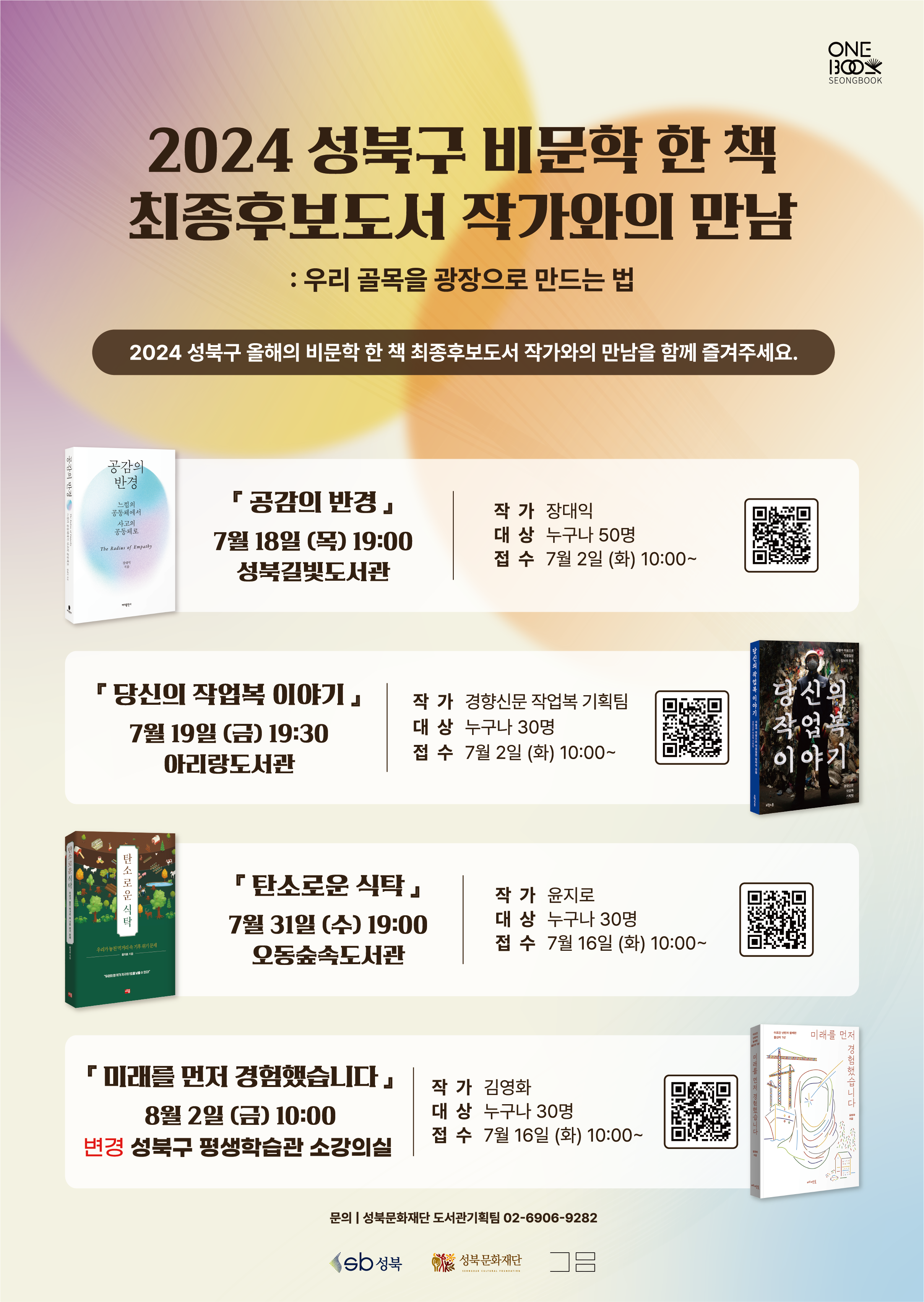 | 2024 성북구 한 책 최종후보도서 작가와의 만남 | 보다 먼 곳으로 넓어지는 우리 곁의 이야기 (0) | 2024.07.19 |