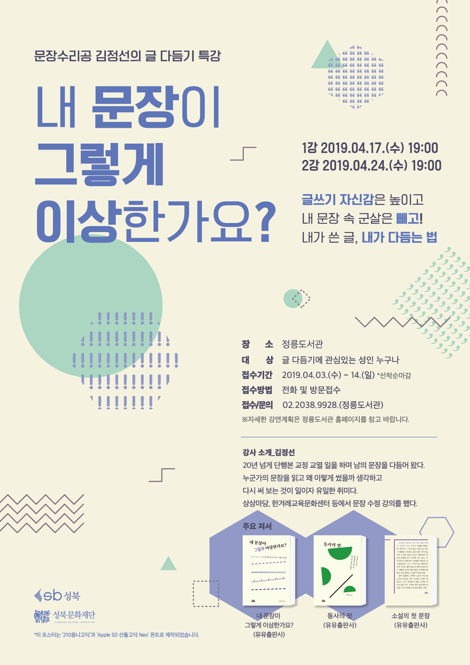 - 내 용: 『동사의 맛』, 『내 문장이 그렇게 이상한가요?』 저자 문장수리공 김정선의 글 다듬기 특강