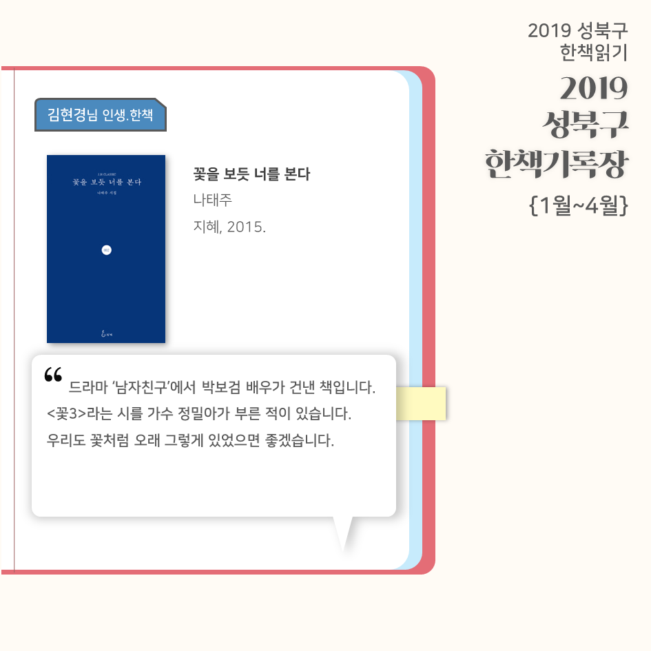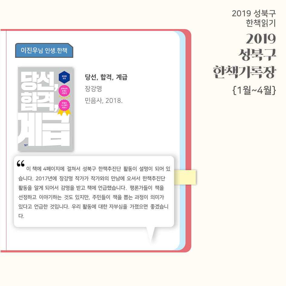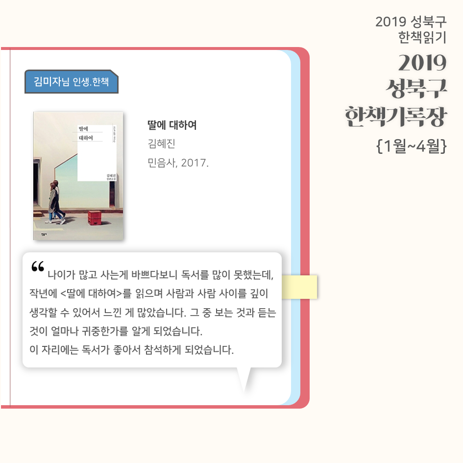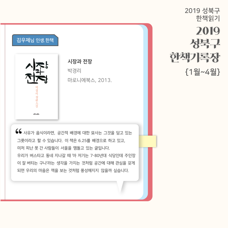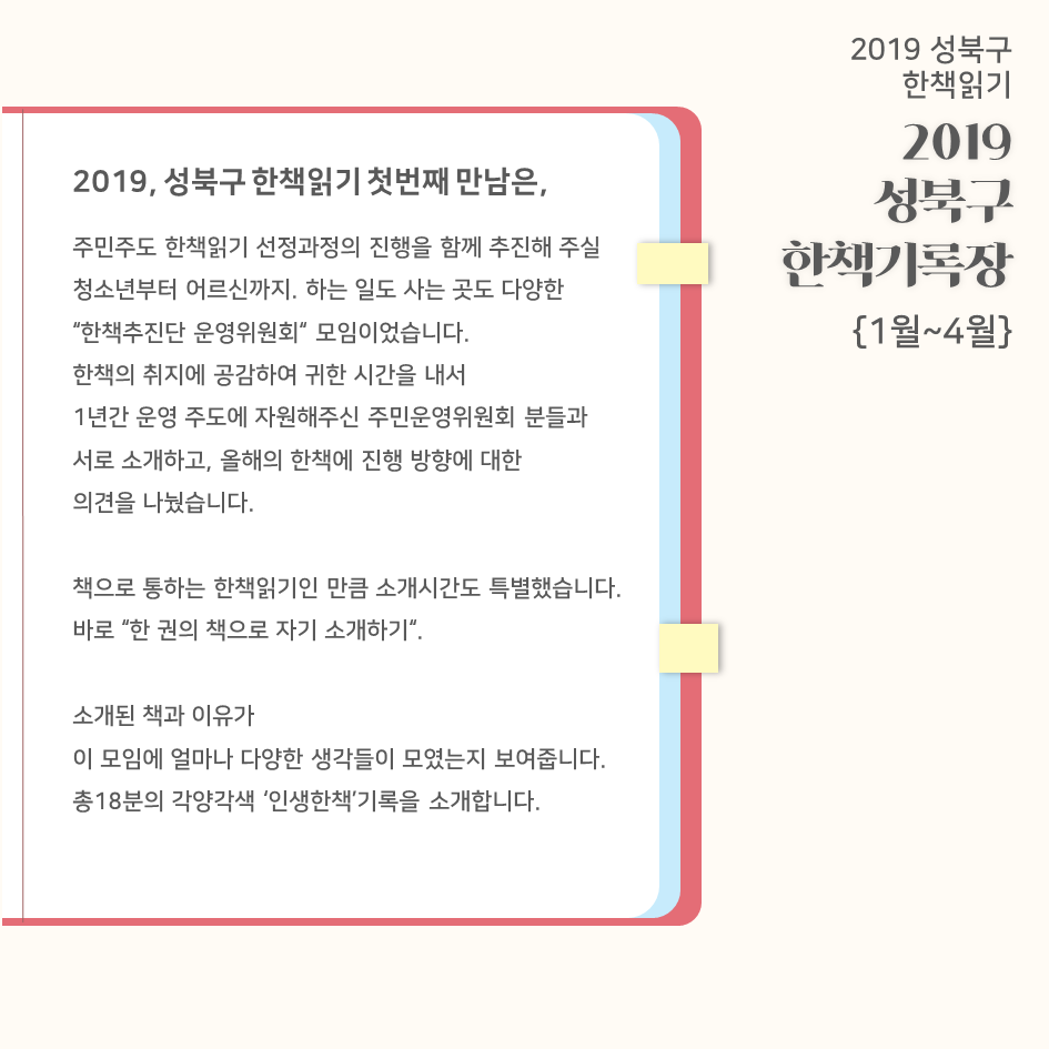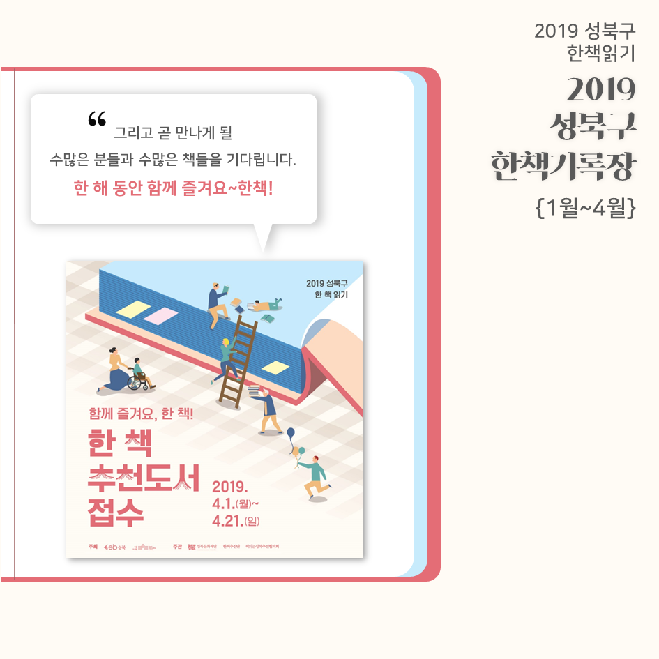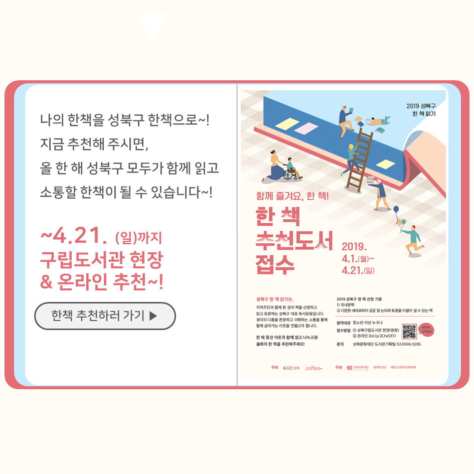 | 2019 성북구 한 책 읽기 - 한책기록장{4~5월}, 한책추진단 모집! (0) | 2019.05.30 |