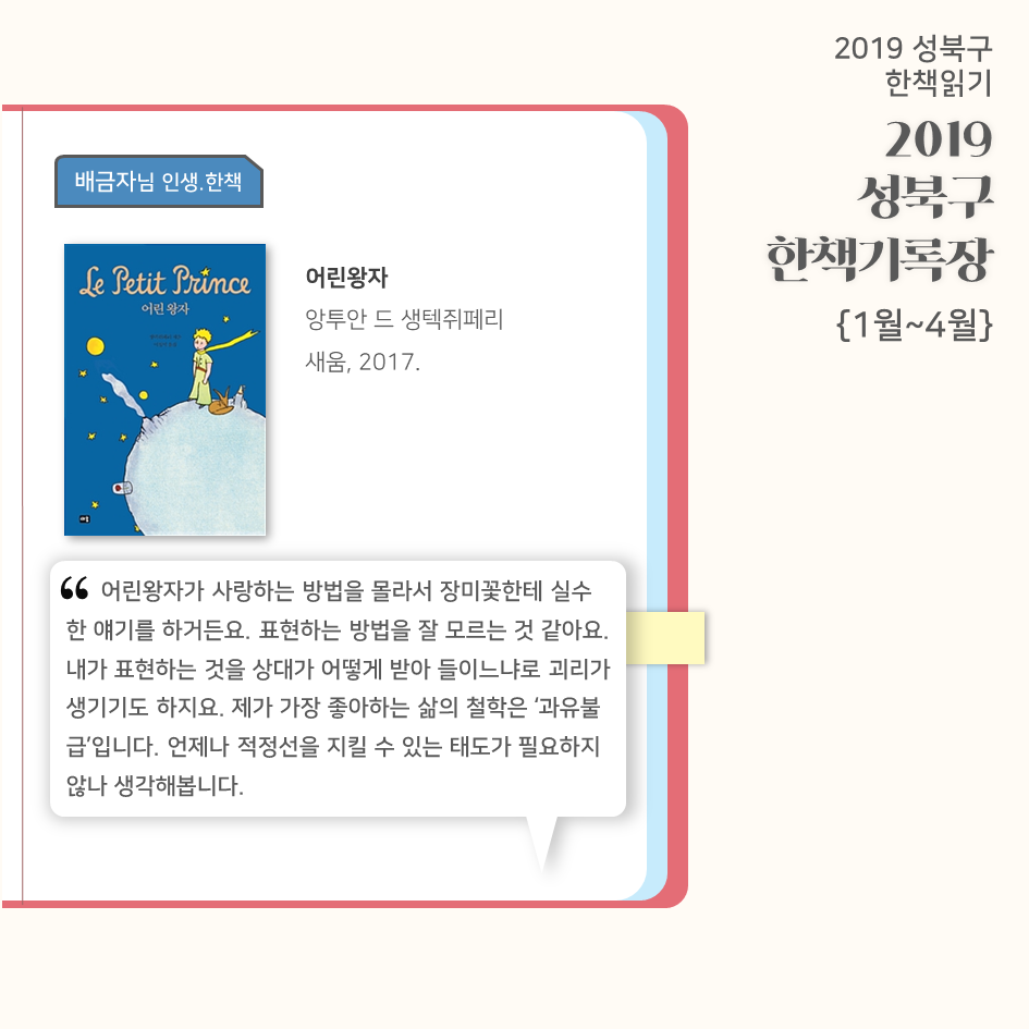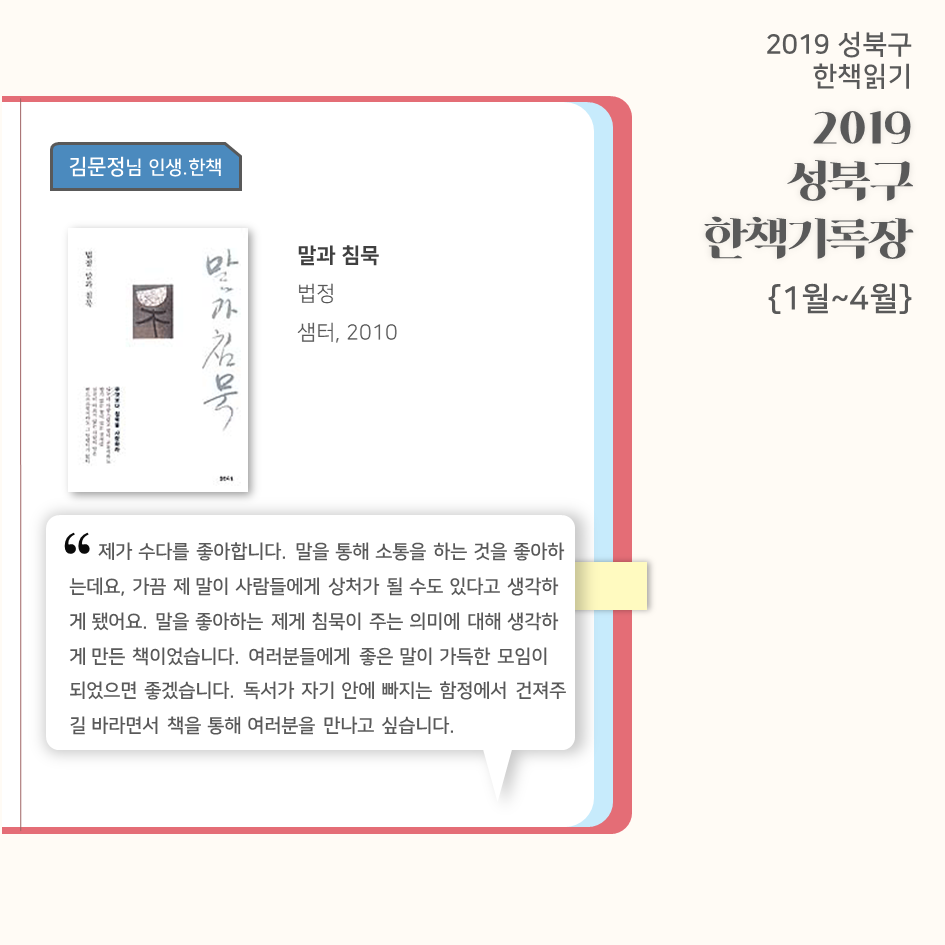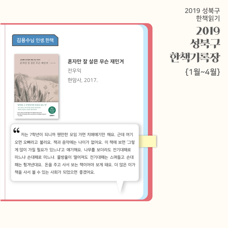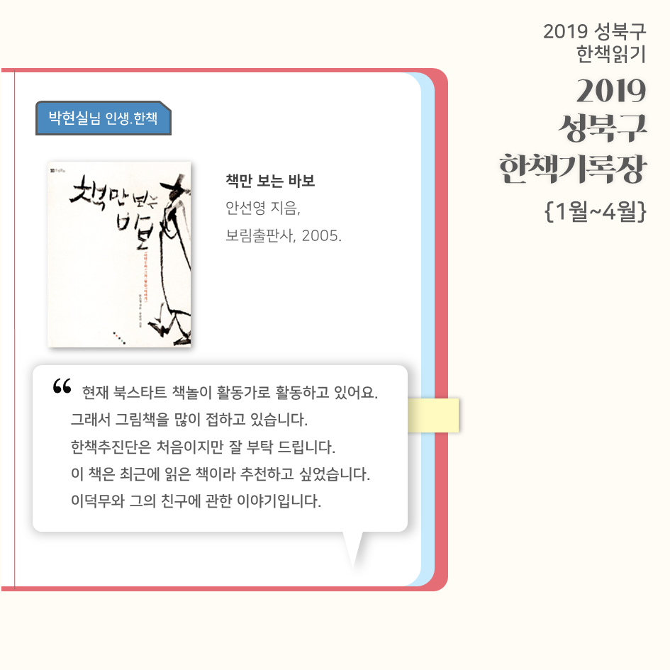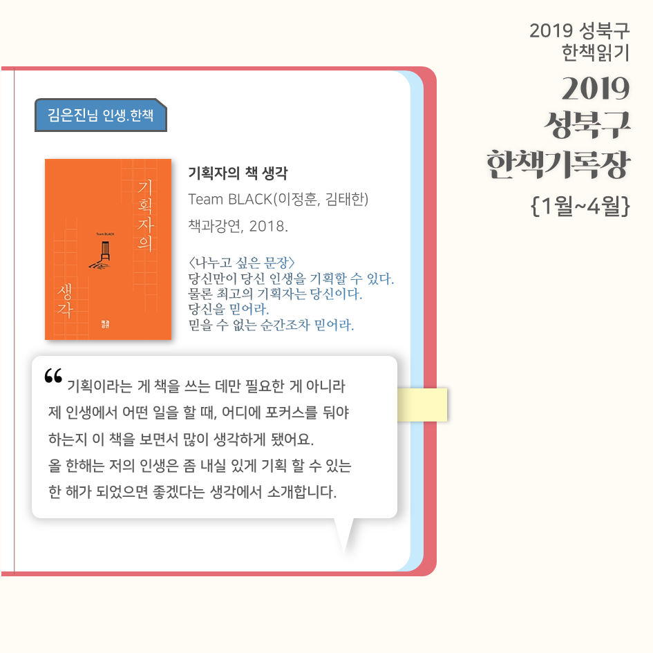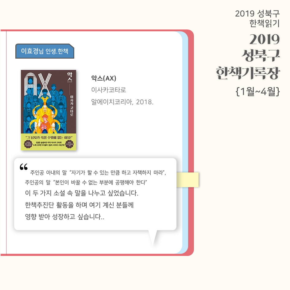 | 2019 성북구 한 책 읽기 - 한책기록장{4~5월}, 한책추진단 모집! (0) | 2019.05.30 |