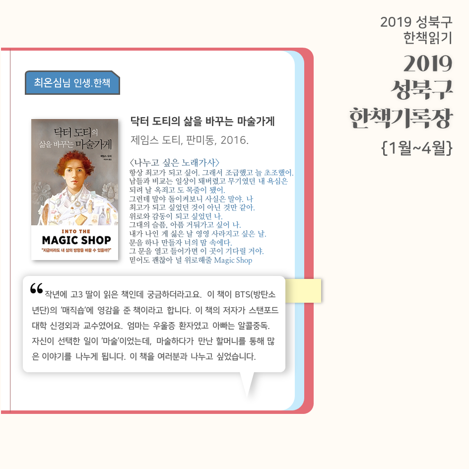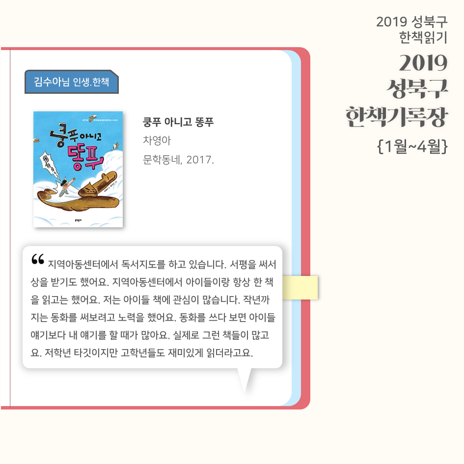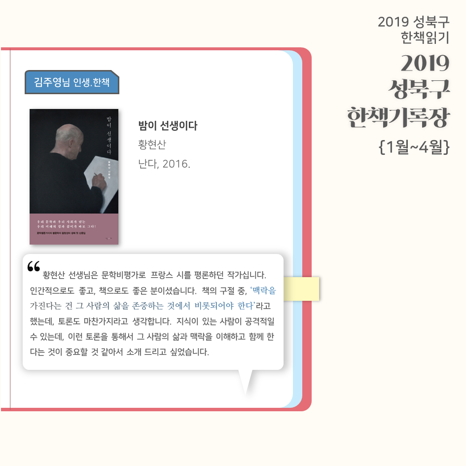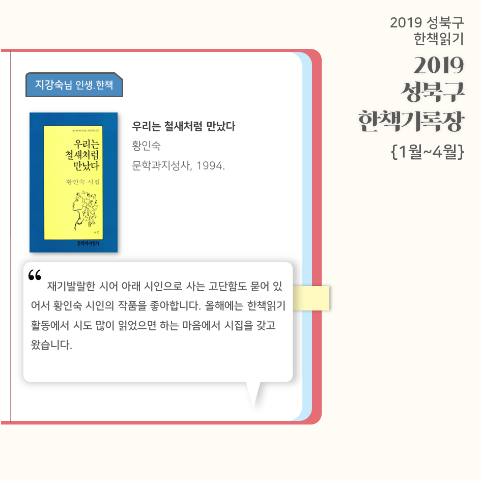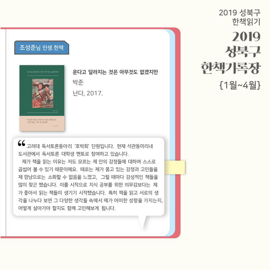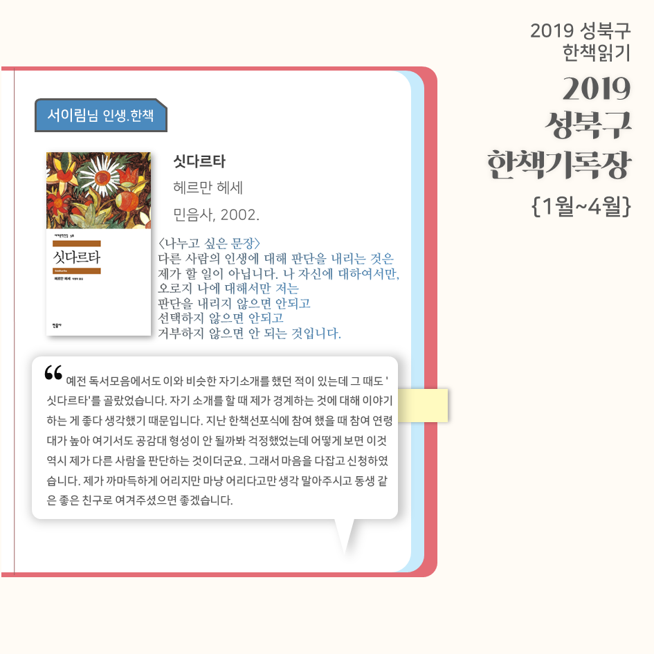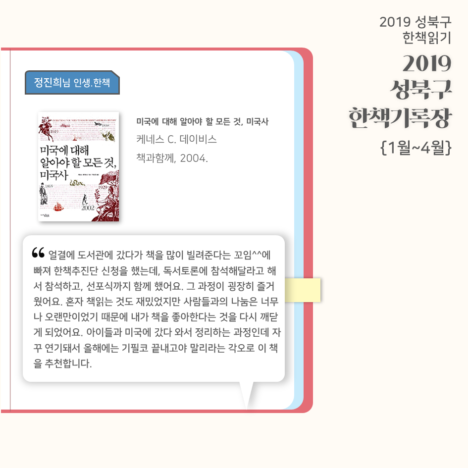 | 2019 성북구 한 책 읽기 - 한책기록장{4~5월}, 한책추진단 모집! (0) | 2019.05.30 |