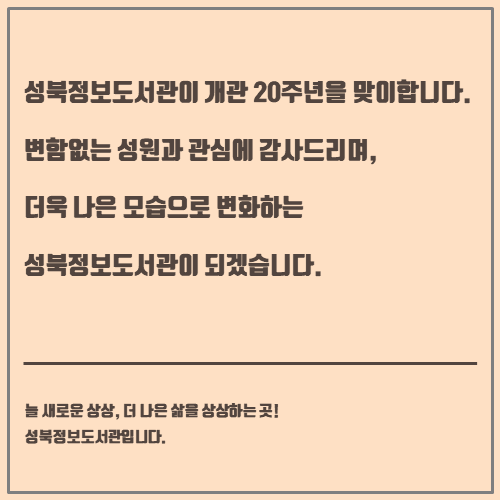 성북정보도서관의 20주년을 맞아 다양하고 새로운 경험을 준비하고 있으니 많이 기대해주세요.